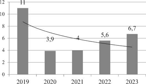 Рис. 6. Затраты на заграничные путешествия из России в период 2019–2023 гг., млрд долларов