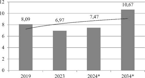 Рис. 9. Совокупная доля продукта туристической отрасли в российском ВВП в период 2019–2034 гг., трлн рублей