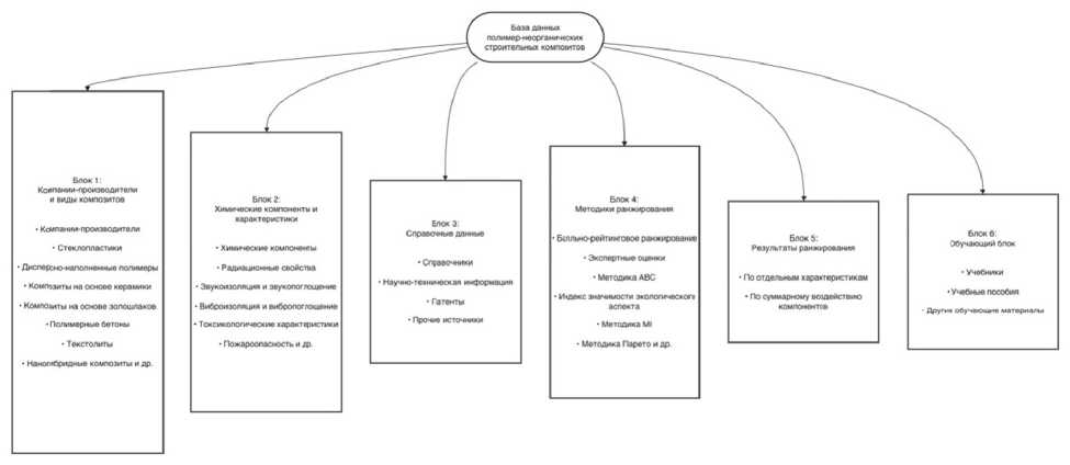 Рисунок 1 – Общая схема базы данных результатов систематизации и ранжирования химических компонентов и экологических характеристик полимер-неорганических строительных композитов