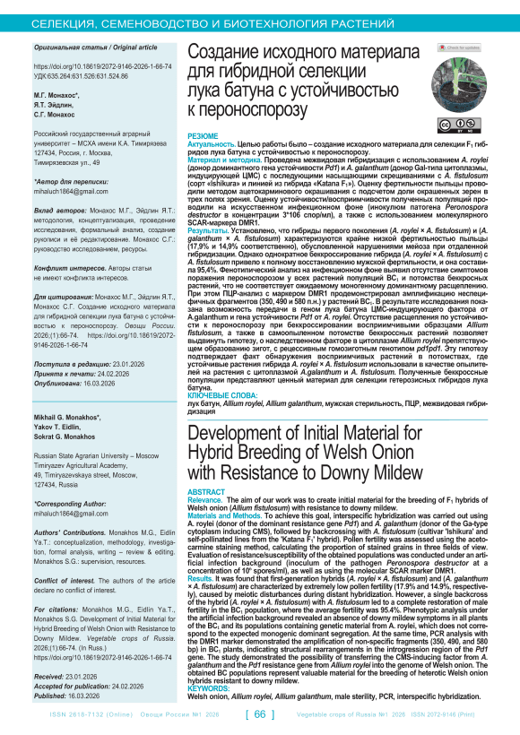 Relevance. The aim of our work was to create initial material for the breeding of F1 hybrids of Welsh onion (Allium fistulosum) with resistance to downy mildew. Materials and Methods. To achieve this goal, interspecific hybridization was carried out using A. roylei (donor of the dominant resistance gene Pd1) and A. galanthum (donor of the Ga-type cytoplasm inducing CMS), followed by backcrossing with A. fistulosum (cultivar 'Ishikura' and self-pollinated lines from the 'Katana F1' hybrid). Pollen fertility was assessed using the acetocarmine staining method, calculating the proportion of stained grains in three fields of view. Evaluation of resistance/susceptibility of the obtained populations was conducted under an artificial infection background (inoculum of the pathogen Peronospora destructor at a concentration of 106 spores/ml), as well as using the molecular SCAR marker DMR1. Results. It was found that first-generation hybrids (A. roylei × A. fistulosum) and (A. galanthum × A. fistulosum) are characterized by extremely low pollen fertility (17.9% and 14.9%, respectively), caused by meiotic disturbances during distant hybridization. However, a single backcross of the hybrid (A. roylei × A. fistulosum) with A. fistulosum led to a complete restoration of male fertility in the BC1 population, where the average fertility was 95.4%. Phenotypic analysis under the artificial infection background revealed an absence of downy mildew symptoms in all plants of the BC1 and its populations containing genetic material from A. roylei, which does not correspond to the expected monogenic dominant segregation. At the same time, PCR analysis with the DMR1 marker demonstrated the amplification of non-specific fragments (350, 490, and 580 bp) in BC1 plants, indicating structural rearrangements in the introgression region of the Pd1 gene. The study demonstrated the possibility of transferring the CMS-inducing factor from A. galanthum and the Pd1 resistance gene from Allium roylei into the genome of Welsh onion. The obtained BC populations represent valuable material for the breeding of heterotic Welsh onion hybrids resistant to downy mildew.