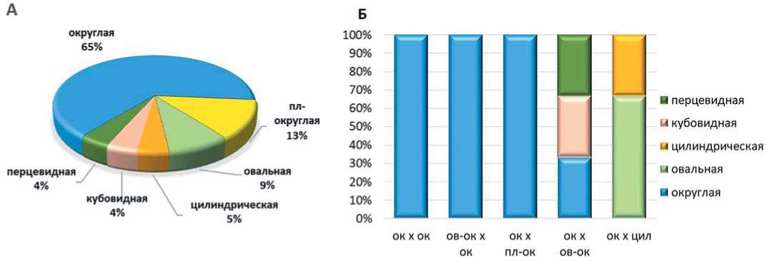 Рис. 1. Общее распределение линий (А) и их соотношение по форме плода в зависимости от комбинации скрещивания родительских компонентов: ок – округлая, ов-ок – овально-округлая, пл-ок – плоско-округлая, ц – цилиндрическая. Fig. 1. The overall distribution of lines (A) and their ratio according to fruit shape depending on the combination of parental components: ок – round, oв-oк – ovate-round, пл-oк – flat-round, ц – cylindrical.