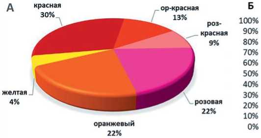 Рис. 2. Общее распределение линий томата (А) и их соотношение по окраске плода в зависимости от комбинации скрещивания родительских компонентов: ж – желтая, ор – оранжевая, роз – розовая, роз-кр – розовато-красная, кр – красная, ор-кр – оранжево-красная