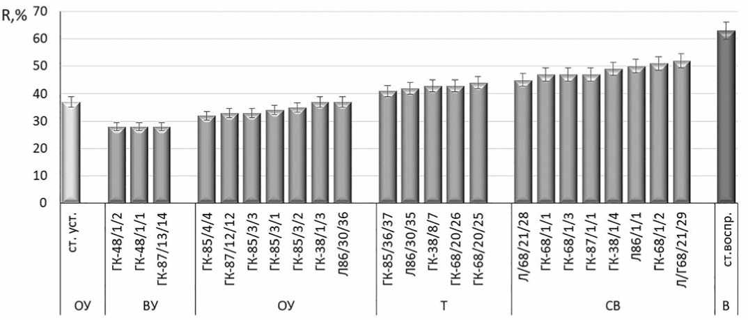 Fig. 3. Distribution of tomato lines into resistance groups based on the degree of alternaria development, R% (average over the season): ВУ – highly resistant; ОУ – relatively resistant; T – tolerant; СВ – moderately susceptible;