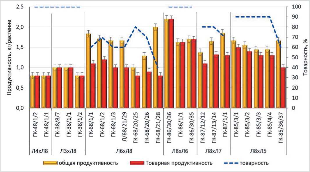 По продуктивности максимальное значение зафиксировано у линий из комбинации Л8хЛ6: ГК-86/1/1 (1,6 кг/раст.), ГК-86/30/35 (1,7 кг/раст.) и ГК-86/30/36 (2,2 кг/раст.) со 100% товарностью плодов. В целом показатель товарности варьировал от 60% до 100%, причем 100% уровень отмечен не только у перечисленных высокопродуктивных линий, но и у линий с более низкой продуктивностью (0,8-1 кг/раст.) из комбинаций Л4хЛ8 и Л3хЛ8 (рис. 4). Снижение товарности плодов остальных линий преимущественно было связано с фракцией мелких нестандартных плодов. Среди них по высокой общей продуктивности (более 1,5 кг/раст.) можно выделить десять линий: ГК-68/1/1, ГК-68/1/2, ГК-68/1/3, Л/68/21/29, ГК-68/21/28, ГК-87/13/14, ГК-87/1/1, ГК-85/3/2, ГК-