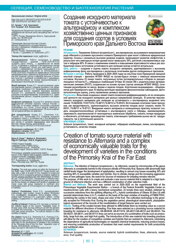 Актуальность. Поражение Solanum lycopersicum L. альтернариозом, вызываемое микромицетами рода Alternaria, в условиях муссонного климата Приморского края носит стабильно вредоносный характер. Сезоны с аномально высоким уровнем осадков провоцируют развитие эпифитотий, в результате чего ежегодные потери урожая могут превышать 30 %, достигая у восприимчивых сортов и гибридов 80 %. В связи с изменением климата и повышением агрессивности новых рас возбудителей поиск источников устойчивости для селекции всегда остается актуальным. Цель работы – создание и оценка нового исходного материала, адаптированного к высокому инфекционному фону альтернариоза с различным сочетанием других селекционных признаков. Материал и методы. Работу проводили в 2020–2025 годах на опытном поле Приморской овощной опытной станции – филиала ФГБНУ ФНЦО – на лугово-бурых почвах с тяжелым механическим составом. Изучены 23 линии томата, полученные путем последовательных отборов из расщепляющихся потомств F2-4 гибридных комбинаций Оттава 30 (линия Л8) с родительскими детерминантными линиями (Л3-Л7), созданными на основе лучших сортов селекции ФГБНУ ФНЦО, сочетающие разнообразие по массе, форме и окраске плодов. Агротехника выращивания – общепринятая для Приморского края. В период вегетации проводили фенологические наблюдения, фитопатологическую оценку, учеты проявления целевых признаков. Результаты. Испытание созданных линий томата позволило дифференцировать их по селекционной ценности как исходного материала для разных направлений селекции. В качестве перспективного исходного материала для селекции на устойчивость к альтернариозу выделено пять линий: ГК-68/20/26, ГК-87/13/14, ГК-48/1/1,ГК-48/1/2 и ГК-85/3/3. Источниками сочетания таких признаков, как продуктивность, крупноплодность высокое качество плодов, могут служить линии ГК-85/3/1, ГК-86/1/1 и ГК-87/1/1. Внедрение нового материала в селекционную практику позволит создать конкурентноспособные устойчивые к альтернариозу сорта и гибриды, минимизировать зависимость агротехнологий от многократных химических обработок, снизить потери продукции и обеспечить устойчивое производство томата, отвечающего требованиям рынка как по продуктивности, так и питательной ценности.