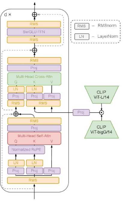 Для адаптации архитектуры VAR к задаче text-to-image необходимо было добавить способ обуславливания на текстовую информацию в блоках трансформера. В нашей архитектуре тексты кодируются двумя замороженными предобученными энкодерами: СЫР ViT-L [4] и OpenCLIP ViT-bigG, текстовые эмбеддинги которых конкатенируются по размерности каналов. Далее, текстовая информация передаётся в модель двумя способами: через операцию cross-attention между визуальными токенами текущего скейла и текстовыми эмбеддингами, а также усреднённый эмбеддинг из текстового энкодера OpenCLIP ViT-bigG используется в качестве стартового токена для генерации. Архитектура транс-формерных блоков, используемых в SWAT, изображена на рис. 1