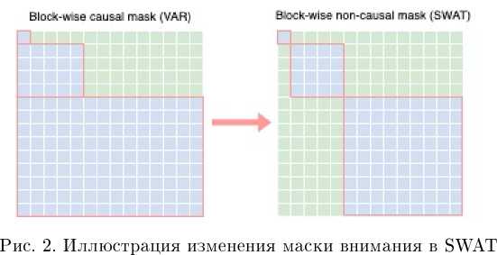 Таким образом, можно заметить, что обуславливание на информацию с предыдущих скейлов происходит дважды: один раз неявно, при формировании входа на текущем шаге генерации, и второй раз явно, так как в операции self-attention в каждом трансформерном блоке используется диагональная матрица внимания, при которой токены, предсказываемые на текущем шаге, взаимодействуют со всеми ранее сгенерированными токенами. Это наблюдение позволяет нам перейти к блочно-диагональной матрице внимания, что делает процедуру сэмплирования более эффективной, так как операции внимания будут потреблять меньше памяти, а также отпадает необходимость хранить в кэше ключи и значения внимания для токенов с прошлых шагов. Сравнение масок внимания в оригинальном VAR и предложенном SWAT приведено на рис. 2.