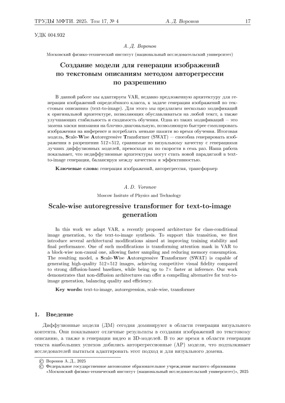 В данной работе мы адаптируем VAR, недавно предложенную архитектуру для генерации изображений определённого класса, к задаче генерации изображений по текстовым описаниям (text-to-image). Для этого мы предлагаем несколько модификаций к оригинальной архитектуре, позволяющих обуславливаться на любой текст, а также улучшающих стабильность и сходимость обучения. Одна из таких модификаций — это замена маски внимания на блочно-диагональную, позволяющую быстрее сэмплировать изображения на инференсе и потреблять меньше памяти во время обучения. Итоговая модель, Scale-Wise Autoregressive Transformer (SWAT) — способна генерировать изображения в разрешении 512×512, сравнимые по визуальному качеству с генерациями лучших диффузионных моделей, превосходя их по скорости в семь раз. Наша работа показывает, что недиффузионные архитектуры могут стать новой парадигмой в texttoimage генерации, балансируя между качеством и эффективностью.
