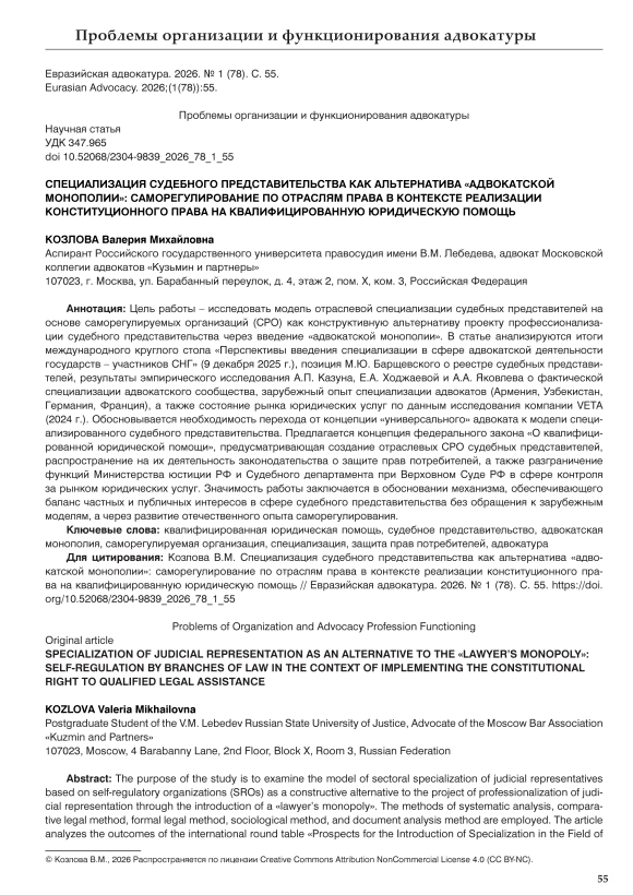 The purpose of the study is to examine the model of sectoral specialization of judicial representatives based on self-regulatory organizations (SROs) as a constructive alternative to the project of professionalization of judicial representation through the introduction of a «lawyer’s monopoly». The methods of systematic analysis, comparative legal method, formal legal method, sociological method, and document analysis method are employed. The article analyzes the outcomes of the international round table «Prospects for the Introduction of Specialization in the Field of Advocacy of the CIS Member States» (December 9, 2025), the position of M.Yu. Barshchevsky on the register of judicial representatives, the results of the empirical study by A.P. Kazun, E.A. Khodzhayeva and A.A. Yakovlev on actual specialization within the bar community, foreign experience of lawyer specialization (Armenia, Uzbekistan, Germany, France), as well as the state of the legal services market according to the VETA research (2024). The necessity of transitioning from the concept of a «universal» advocate to a model of specialized judicial representation is substantiated. A concept of the federal law «On Qualified Legal Assistance» is proposed, providing for the creation of sectoral SROs of judicial representatives, the extension of consumer protection legislation to their activities, and the delineation of functions of the Ministry of Justice of the Russian Federation and the Judicial Department of the Supreme Court of the Russian Federation in controlling the legal services market. The significance of the work lies in justifying a mechanism that ensures the balance of private and public interests in the field of judicial representation through the development of domestic self-regulation experience rather than borrowing foreign models.
