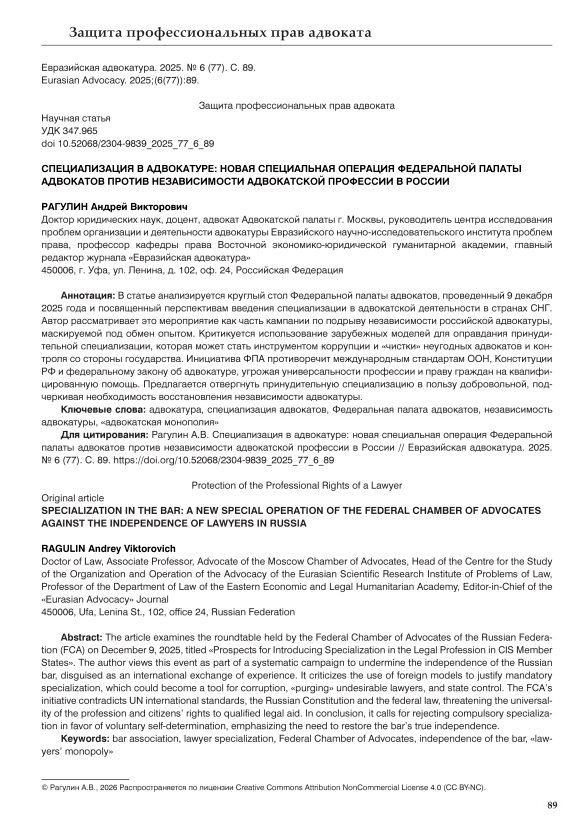 В статье анализируется круглый стол Федеральной палаты адвокатов, проведенный 9 декабря 2025 года и посвященный перспективам введения специализации в адвокатской деятельности в странах СНГ. Автор рассматривает это мероприятие как часть кампании по подрыву независимости российской адвокатуры, маскируемой под обмен опытом. Критикуется использование зарубежных моделей для оправдания принудительной специализации, которая может стать инструментом коррупции и «чистки» неугодных адвокатов и контроля со стороны государства. Инициатива ФПА противоречит международным стандартам ООН, Конституции РФ и федеральному закону об адвокатуре, угрожая универсальности профессии и праву граждан на квалифицированную помощь. Предлагается отвергнуть принудительную специализацию в пользу добровольной, подчеркивая необходимость восстановления независимости адвокатуры.