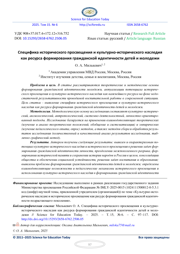 Проблема и цель. В статье рассматриваются теоретические и методические основы формирования гражданской идентичности молодежи, актуализации потенциала исторического просвещения и культурно-исторического наследия как важнейшего ресурса на фоне недостаточной результативности проводимой воспитательной работы в современной ситуации. Цель статьи – выявление специфики исторического просвещения и культурно-исторического наследия как ресурса формирования гражданской идентичности детей и молодежи. Методология. Методологическую основу исследования составляют культурно-исторический, аксиологический, антропологический, системно-деятельностный, личностно-ориентированный подходы. Исследование базируется на применении взаимодополняющих теоретических (изучение и анализ теоретических положений, обобщение и систематизация) и эмпирических (изучение педагогического опыта, опрос) методов, а также методов сбора и обработки результатов исследования (количественный и качественный анализ результатов исследования, таблично-графический метод). Результаты. Автором получены следующие результаты: выявлен и охарактеризован потенциал культурно-исторического наследия и исторического просвещения в решении задач формирования гражданской идентичности личности, преодолении межпоколенного разрыва, формировании исторической памяти и сохранении истории народов и России в целом, консолидации общества и обеспечении социальной устойчивости, решении задач воспитания и образования; выявлены проблемы формирования гражданской идентичности детей и молодежи; определены взаимодополняющие возможности и педагогические механизмы исторического просвещения и использования культурно-исторического наследия в формировании гражданской идентичности личности; охарактеризовано содержание и методический инструментарий формирования гражданской идентичности для обучающихся начального общего, основного общего, среднего общего, среднего профессионального образования. Заключение. Историческое просвещение и культурно-историческое наследие являются смыслообразующими компонентами воспитательной работы и важнейшим ресурсом формирования гражданской идентичности детей и молодежи в изменяющихся историкои социальнокультурных условиях с учетом задач воспитания, преемственности содержания и форм приобщения обучающихся к истории и культуре страны, региона, места жительства.