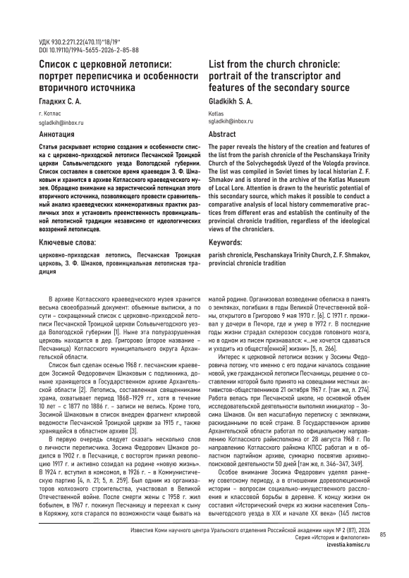 IDR: 149150731 | УДК: 930.2:271.22(470.11)"18/19" | DOI: 10.19110/1994-5655-2026-2-85-88