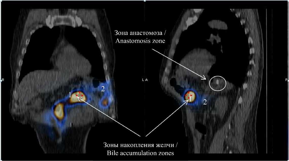 На рис. 8 можно видеть зоны накопления желчи, обозначенные оранжевым цветом (1), и сине-фиолетовое «рассеивание» (2) препарата при сцинтиграфии, которые не распространялись выше зоны анастомоза, что демонстрирует его антирефлюкс-ные свойства.