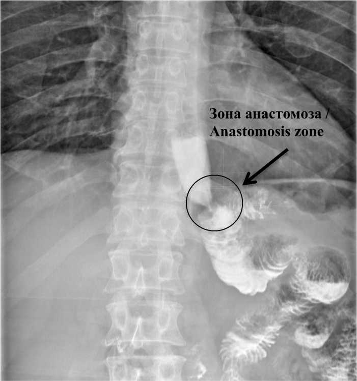 Во всех случаях контрастная взвесь свободно проходила через анастомоз без задержек и признаков анастомозита. При повышении внутри-брюшного давления на вдохе рефлюкса контрастного вещества не отмечено.