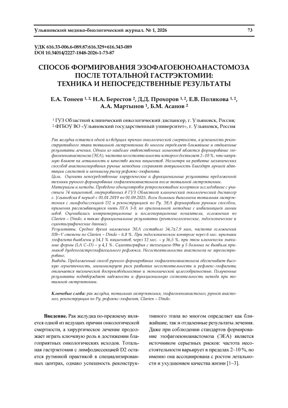 Рак желудка остается одной из ведущих причин онкологической смертности, а успешность реконструктивного этапа тотальной гастрэктомии во многом определяет ближайшие и отдаленные результаты лечения. Одним из наиболее ответственных моментов является формирование эзофагоеюноанастомоза (ЭЕА), частота несостоятельности которого достигает 2–10 %, что напрямую влияет на летальность и качество жизни пациентов. Несмотря на развитие механических способов анастомозирования ручные методики сохраняют актуальность благодаря лучшей адаптации слизистой и меньшему риску рефлюкс-эзофагита. Цель. Оценить непосредственные хирургические и функциональные результаты предложенной техники ручного формирования эзофагоеюноанастомоза после тотальной гастрэктомии. Материалы и методы. Проведено одноцентровое ретроспективное когортное исследование с участием 74 пациентов, оперированных в ГУЗ Областной клинический онкологический диспансер г. Ульяновска в период с 01.01.2019 по 01.09.2025. Всем больным выполнена тотальная гастрэктомия с лимфодиссекцией D2 и реконструкцией по Ру. ЭЕА формировали ручным способом, применяя рассасывающуюся нить ПГА 3-0, по оригинальной методике с инвагинацией линии швов. Оценивались интраоперационные и послеоперационные показатели, осложнения по Clavien – Dindo, а также функциональные результаты (рентгенологические, эндоскопические и сцинтиграфические данные). Результаты. Среднее время наложения ЭЕА составило 34,7±7,9 мин, частота осложнений IIIb–V степени по Clavien – Dindo – 6,8 %. При эндоскопическом контроле через 6 мес. признаки эзофагита выявлены у 54,1 % пациентов, через 12 мес. – у 36,5 %, при этом клинически значимые формы (LA C–D) – у 4,1 %. Сцинтиграфия с технецием-99m у 5 больных не выявила признаков дуоденогастроэзофагеального рефлюкса. Несостоятельности анастомоза не зарегистрировано. Выводы. Предложенный способ ручного формирования эзофагоеюноанастомоза обеспечивает высокую герметичность, минимизирует риск развития несостоятельности и рефлюкс-эзофагита, отличается технической воспроизводимостью и экономической целесообразностью. Полученные результаты подтверждают надежность и функциональную состоятельность метода при тотальной гастрэктомии.