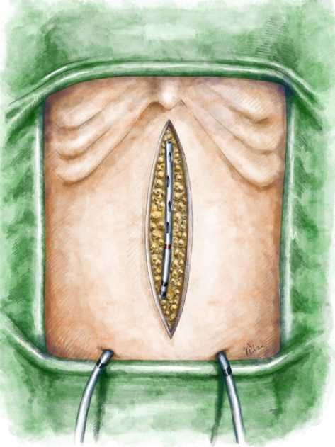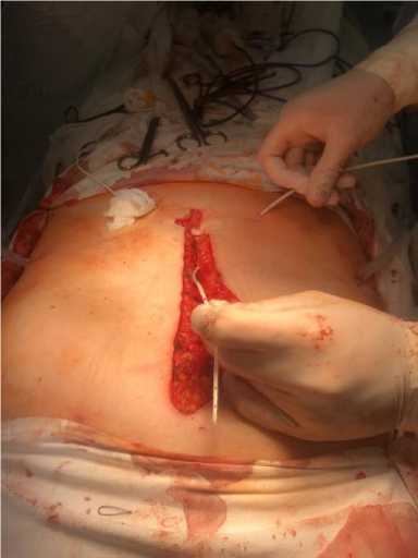 Выполняется ушивание апоневроза либо узловым капроновым швом, либо непрерывной петлей из полидиоксанона. Затем в подкожножировую клетчатку передней брюшной стенки через контрапертуру, расположенную в 3 см от основного лапаротомного разреза, устанавливается 2-й перфорированный микроирригатор (с противоположной стороны от 1-го) (рис. 2).