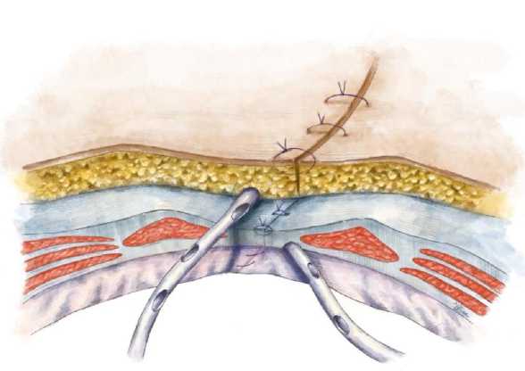 Подкожно-жировая клетчатка также ушивается отдельными узловыми швами атравматичной иглой. Микроирригаторы должны быть расположены на всем протяжении раневой поверхности (рис. 3, 4). Такое расположение катетеров позволяет обеспечивать непре- рывную инфузию анестетика и периодическое введение антисептика, что создает оптимальные условия для обезболивания и предотвращения инфекционных осложнений. Далее кожа ушивается отдельными узловыми швами (рис. 5).