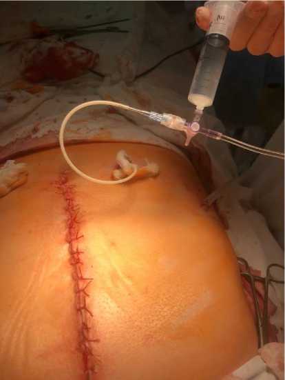 В первый установленный в предбрюшин-ное пространство катетер в качестве анестетика непрерывно при помощи дозатора-помпы со скоростью 5 мл/ч в течение 3 сут вводится 0,2 % ропивакаин. Во второй микро- ирригатор, установленный в подкожно-жировой клетчатке, в качестве антисептика бо-люсно по 20 мл 3 р./сут с интервалом 8 ч на протяжении 3 сут вводится раствор повидон-йода (рис. 6).