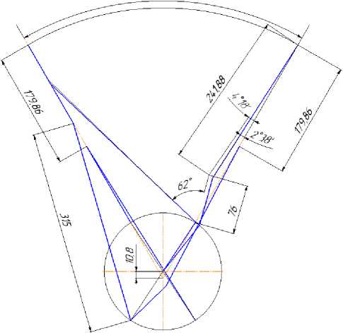 Графическое построение кинематической схемы КШМ и элементов двигателя, представленное на рис. 2, позволяет отметить равенство хода поршней (179,86 мм) в главном и боковом цилиндрах в соответствии с параметрами КШМ, представленными по варианту 2 (см. табл. 2).