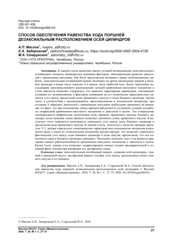 В данной статье выполнен анализ условий возникновения дополнительного изгибающего момента, являющегося основным фактором, лимитирующим развитие двигателей с прицепными шатунами. Как было представлено авторами в ранее опубликованных работах, дополнительный изгибающий момент возникает во время нахождения поршня в боковом цилиндре в конце такта «сжатие» и в начале такта «рабочий ход». Более тщательное исследование пространственного расположения деталей кривошипно-шатунного механизма и узлов двигателя позволяет утверждать, что наиболее характерным параметром, отвечающим условиям его возникновения, и фактором, влияющим на его технические характеристики, является угол между продольной осью прицепного шатуна и осью бокового цилиндра. Кроме этого, в соответствии с рекомендациями, представленными в технической литературе, при создании V-образных двигателей с прицепными шатунами необходимо принимать во внимание тот факт, что при уменьшении длины прицепа наблюдается улучшение условий для работы сопряжений кривошипно-шатунного механизма и двигателя в целом. Это утверждение подтверждается графическим построением осей: прицепа, прицепного шатуна, бокового цилиндра, когда меньшая длина прицепа позволяет увеличить длину прицепного шатуна. В результате этого появляется возможность уменьшить угол между осью бокового цилиндра и продольной осью прицепного шатуна. В данной статье, используя в качестве примера двигатель V-2, авторы определили геометрические характеристики компонентов механизма коленчатого вала, а также их относительное положение внутри картера. Это позволяет определить фактический угол между осью бокового цилиндра и осью шатуна, предполагая, что оси коленчатого вала и бокового цилиндра совпадают. Численное значение этого угла является критерием оценки работоспособности кривошипно-шатунного механизма и двигателя в целом. Кроме этого, знание угла позволяет скорректировать момент подачи предварительной и основной фазы топлива при внедрении его двухфазной схемы.