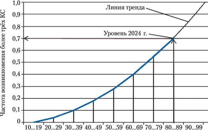 Рис. 1. Прогноз зависимости частоты возникновения более трёх конфликтных ситуаций (КС) от количества требуемых сеансов связи (рисунок создан авторами)