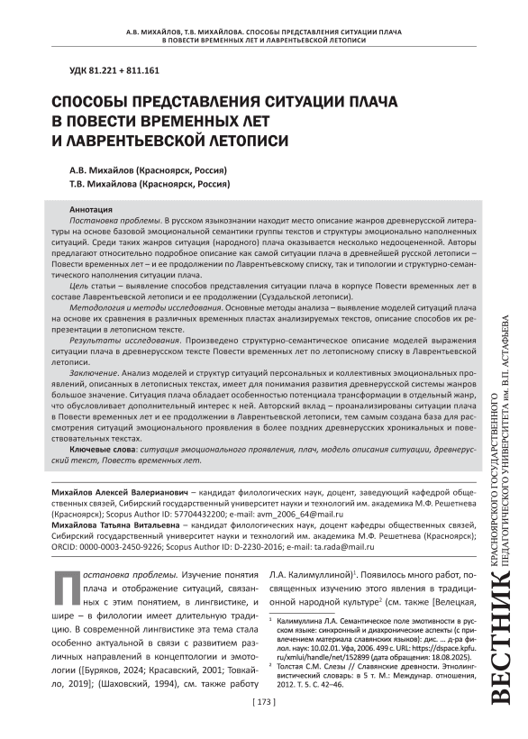 Постановка проблемы. В русском языкознании находит место описание жанров древнерусской литературы на основе базовой эмоциональной семантики группы текстов и структуры эмоционально наполненных ситуаций. Среди таких жанров ситуация (народного) плача оказывается несколько недооцененной. Авторы предлагают относительно подробное описание как самой ситуации плача в древнейшей русской летописи – Повести временных лет – и ее продолжении по Лаврентьевскому списку, так и типологии и структурно-семантического наполнения ситуации плача. Цель статьи – выявление способов представления ситуации плача в корпусе Повести временных лет в составе Лаврентьевской летописи и ее продолжении (Суздальской летописи). Методология и методы исследования. Основные методы анализа – выявление моделей ситуаций плача на основе их сравнения в различных временных пластах анализируемых текстов, описание способов их репрезентации в летописном тексте. Результаты исследования. Произведено структурно-семантическое описание моделей выражения ситуации плача в древнерусском тексте Повести временных лет по летописному списку в Лаврентьевской летописи. Заключение. Анализ моделей и структур ситуаций персональных и коллективных эмоциональных проявлений, описанных в летописных текстах, имеет для понимания развития древнерусской системы жанров большое значение. Ситуация плача обладает особенностью потенциала трансформации в отдельный жанр, что обусловливает дополнительный интерес к ней. Авторский вклад – проанализированы ситуации плача в Повести временных лет и ее продолжении в Лаврентьевской летописи, тем самым создана база для рассмотрения ситуаций эмоционального проявления в более поздних древнерусских хроникальных и повествовательных текстах.