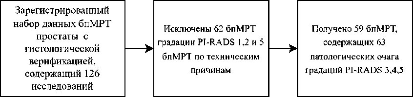 Критерии включения: наличие бпМРТ с Т2-ВИ, ДВИ, ИКД в аксиальной плоскости; клиническая информация об уровнях свободного и связанного простатспецифического антигена крови; проведённая таргетная МРТ/ТрУЗИ фьюжн-биопсия при соблюдении временного интервала между МРТ и биопсией не более 14 дней, наличие одного или нескольких очагов, соответствующих градации PI-RADS 3 и выше в периферической или переходной зоне предстательной железы.