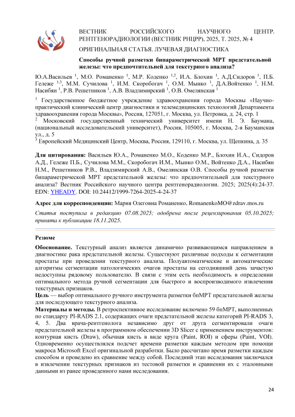 Обоснование. Текстурный анализ является динамично развивающимся направлением в диагностике рака предстательной железы. Существуют различные подходы к сегментации простаты при проведении текстурного анализа. Полуавтоматические и автоматические алгоритмы сегментации патологических очагов простаты на сегодняшний день зачастую недоступны рядовому пользователю. В связи с этим есть необходимость в определении оптимального метода ручной сегментации для быстрого и воспроизводимого извлечения текстурных признаков. Цель — выбор оптимального ручного инструмента разметки бпМРТ предстательной железы для последующего текстурного анализа. Материалы и методы. В ретроспективное исследование включено 59 бпМРТ, выполненных по стандарту PI-RADS 2.1, содержащих очаги предстательной железы категорий PI-RADS 3, 4, 5. Два врача-рентгенолога независимо друг от друга сегментировали очаги предстательной железы в программном обеспечении 3D Slicer с применением инструментов: контурная кисть (Draw), обычная кисть в виде круга (Paint, ROI) и сферы (Paint, VOI). Одновременно осуществлялся подсчет времени разметки каждым методом при помощи макроса Microsoft Excel оригинальной разработки. Было рассчитано время разметки каждым способом и проведено их сравнение между собой. Последний этап исследования заключался в извлечении текстурных признаков из тестовой разметки и сравнении их с эталонными данными из ранее проведенного нами исследования. Результаты. Медиана времени разметки контурной кистью составила 34,2 (18;67,8) секунд для разметчика 1 и 31,8 (19,2;55,2) секунд для разметчика 2. При использовании кисти в виде круга время разметки составило 27 (16,8;45) секунд для разметчика 1 и 30 (18;49,8) секунд для разметчика 2, кисти в виде сферы — 16,8 (13,8;19,8) и 16,2 (10,8;19,2) секунд соответственно. Наиболее быстрым методом сегментации для обоих разметчиков стала кисть в виде сферы (p<0,05). Получено 3 текстурных признака (3%), воспроизводимых между консенсусной разметкой и разметкой, полученной с использованием инструмента «сфера». Заключение. Использование кисти в виде сферы (VOI) значительно упрощает и ускоряет процесс сегментации по сравнению с традиционной контурной кистью, при этом уменьшая количество воспроизводимых текстурных показателей. В ходе исследования определены два текстурных показателя, устойчивых к вариабельности разметки.