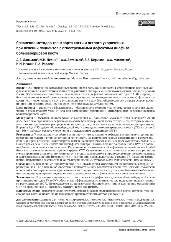 Введение. Применение высокоточных боеприпасов большой мощности в современных военных конфликтах привело к увеличению количества раненых с обширными дефектами диафиза большеберцовой кости. Эффективными способами замещения таких дефектов являются методы Г.А. Илизарова, — би- или полилокальный остеосинтез с последующим перемещением отломков и (или) фрагментов кости по отношению друг к другу («транспорт кости» в зарубежной литературе), а также острое, постепенное или комбинированное укорочение с последующим удлинением. Цель работы — сравнить эффективность и безопасность методов транспорта кости и острого укорочения с последующим удлинением при замещении (ликвидации) огнестрельных дефектов диафиза большеберцовой кости. Материалы и методы. В исследование включены 60 пациентов мужского пола в возрасте от 18 до 59 лет с огнестрельными дефектами диафиза большеберцовой кости от 2 до 16 см, которые в зависимости от метода лечения распределены на две группы, сопоставимые по основным характеристикам. В группе 1 (n = 30) дефект большеберцовой кости замещали методом транспорта кости (ТК), в группе 2 (n = 30) — методом острого укорочения с последующим удлинением (ОУУ). Результаты. У всех пациентов обеих групп достигнуто замещение дефекта, восстановлены длина поврежденной голени и опорная функция конечности. По критериям «время консолидации в месте стыковки» и «время созревания регенерата» отмечено статистически значимое преимущество метода ОУУ. Общее время лечения и индекс внешней фиксации при ТК были больше по сравнению с ОУУ, но различия были статистически не значимы. Результаты по анатомической и функциональной шкале ASAMI были статистически значимо лучше в группе ОУУ. Существенные статистически значимые различия между группами выявлены по количеству и видам развившихся в процессе лечения незначительных и серьезных осложнений. Несращение и инвагинацию наблюдали только в группе ТК. Различия в отношении нарушения оси сегмента и контрактуры смежных суставов были статистически незначимыми. Обсуждение. Выявленные преимущества ОУУ обусловлены отсутствием недостатков, которые характерны для ТК: длительное отсутствие контакта между отломками кости, технические сложности и большой срок перемещения фрагмента кости от одного отломка к другому, необходимость обеспечения сращения одновременно двух очагов повреждения кости (зона дефекта и зона регенерата). Заключение. При лечении пациентов с огнестрельными дефектами диафиза большеберцовой кости применение методов ТК и ОУУ обеспечило эффективность с возможностью получения положительного результата до 100 %. Преимущество по показателям безопасности (вид и количество осложнений) ОУУ по сравнению с ТТ оказалось статистически значимым.