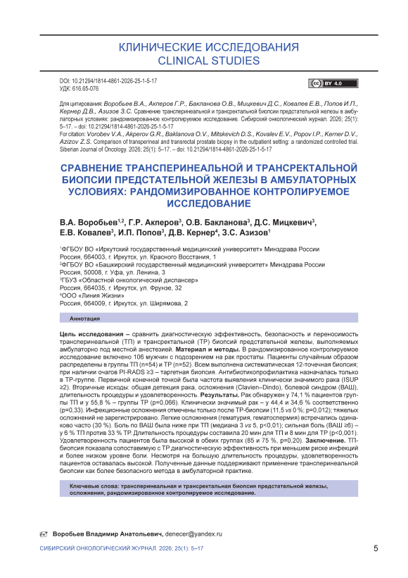 Цель исследования – сравнить диагностическую эффективность, безопасность и переносимость трансперинеальной (ТП) и трансректальной (ТР) биопсий предстательной железы, выполняемых амбулаторно под местной анестезией. Материал и методы. В рандомизированное контролируемое исследование включено 106 мужчин с подозрением на рак простаты. Пациенты случайным образом распределены в группы ТП (n=54) и ТР (n=52). Всем выполнена систематическая 12-точечная биопсия; при наличии очагов PI-RADS ≥3 – таргетная биопсия. Антибиотикопрофилактика назначалась только в ТР-группе. Первичной конечной точкой была частота выявления клинически значимого рака (ISUP ≥2). Вторичные исходы: общая детекция рака, осложнения (Clavien–Dindo), болевой синдром (ВАШ), длительность процедуры и удовлетворенность. Результаты. Рак обнаружен у 74,1 % пациентов группы ТП и у 55,8 % – группы ТР (p=0,066). Клинически значимый рак – у 44,4 и 34,6 % соответственно (p=0,33). Инфекционные осложнения отмечены только после ТР-биопсии (11,5 vs 0 %; p=0,012); тяжелых осложнений не зарегистрировано. Легкие осложнения (гематурия, гематоспермия) встречались одинаково часто (30 %). Боль по ВАШ была ниже при ТП (медиана 3 vs 5, p<0,01); сильная боль (ВАШ ≥6) – у 6 % ТП против 33 % ТР. Длительность процедуры составила 20 мин для ТП и 8 мин для ТР (p<0,001). Удовлетворенность пациентов была высокой в обеих группах (85 и 75 %, p=0,20). Заключение. ТПбиопсия показала сопоставимую с ТР диагностическую эффективность при меньшем риске инфекций и более низком уровне боли. Несмотря на большую длительность процедуры, удовлетворенность пациентов оставалась высокой. Полученные данные поддерживают применение трансперинеальной биопсии как более безопасного метода в амбулаторной практике.