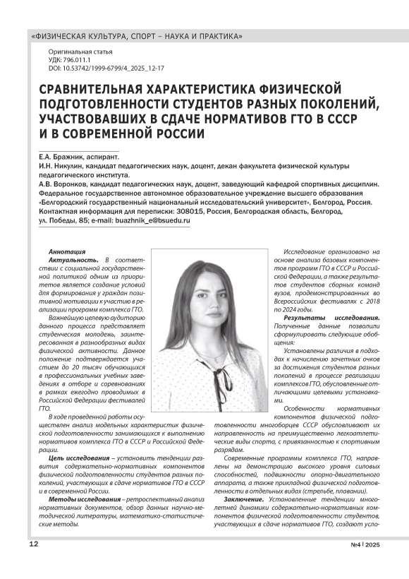 СРАВНИТЕЛЬНАЯ ХАРАКТЕРИСТИКА ФИЗИЧЕСКОЙ ПОДГОТОВЛЕННОСТИ СТУДЕНТОВ РАЗНЫХ ПОКОЛЕНИЙ, УЧАСТВОВАВШИХ В СДАЧЕ НОРМАТИВОВ ГТО В СССР И В СОВРЕМЕННОЙ РОССИИ
