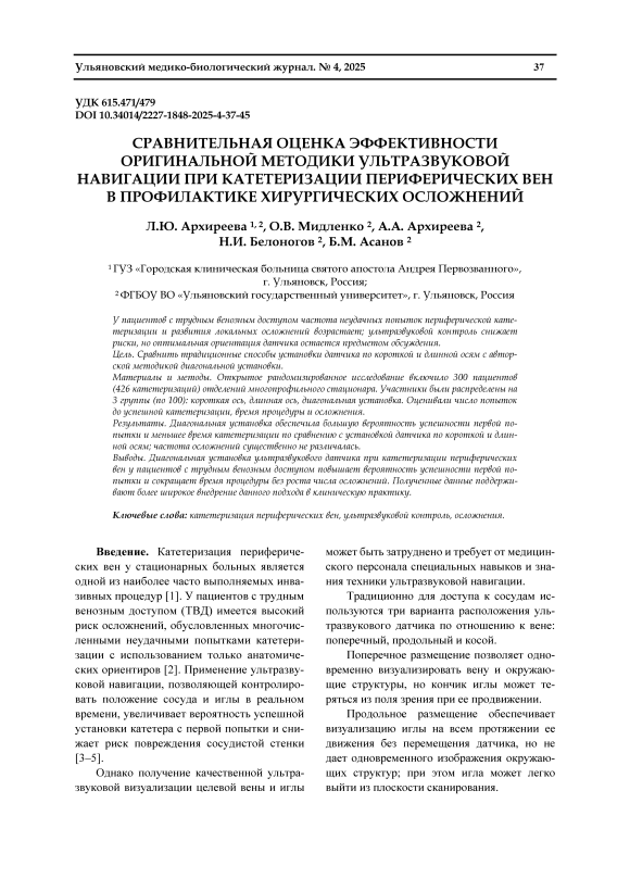 Текст научной статьи Сравнительная оценка эффективности оригинальной методики ультразвуковой навигации при катетеризации периферических вен в профилактике хирургических осложнений