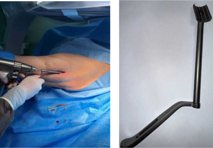 Другим важным практическим аспектом нашей работы стала разработка и успешное применение направляющего устройства для установки дистального винта. Начальный опыт подтвердил, что корректное проведение дистальной спицы под углом 150° является технически сложной задачей, часто требующей многократных попыток и ведущей к избыточной травматизации кортикала. Направитель не только сократил время операции в среднем на 20 минут, но и повысил точность и безопасность вмешательства, что особенно важно на этапе освоения методики. Снижение риска многократного пе-ресверливания кортикала также потенциально минимизирует вероятность такого редкого, но грозного осложнения, как подвертельный перелом бедренной кости.
