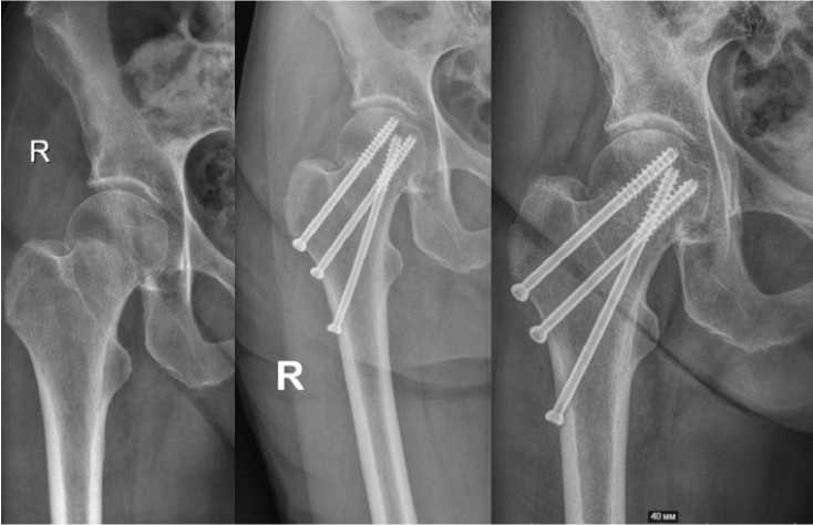 Рентгенологическая оценка: рентгенография тазобедренных суставов в стандартных проекциях. Оценивались: факт и сроки консолидации, величина укорочения шейки бедра (метод Zlowodzki [18]), наличие и степень варусной деформации (изменение шеечно-диафизарного угла), миграция винтов (>5 мм), признаки АНГБК, формирование ложного сустава.
