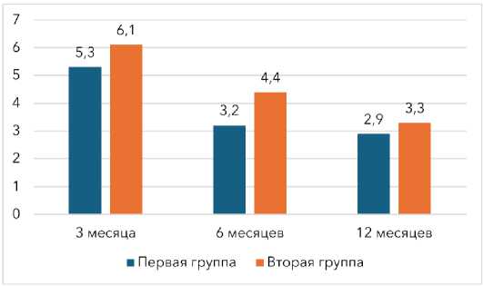 Динамика функционального восстановления по шкале HHS была положительной в обеих группах, однако в группе BDSF восстановление происходило быстрее (рис. 4). Уже через 6 месяцев средний балл HHS в группе BDSF составил 88,2±5,1, тогда как в группе сравнения – 74,9±9,5 (статистическая тенденция, p>0,05). Через 12 месяцев после операции значения выровнялись, но в группе BDSF сохранялся более высокий средний балл (89,6±4,7 против 82,7±7,4 баллов; p>0,05). Интенсивность болевого синдрома по ВАШ к 12 месяцам снизилась до минимальных значений в обеих группах (2,9±1,4 см и 3,3±1,3 см соответственно; p>0,05) (рис. 5).