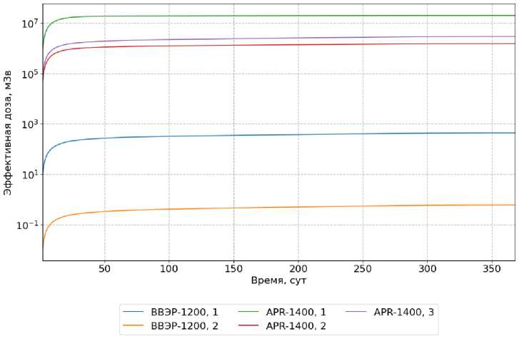 Расчёты максимальных дозовых нагрузок на всё тело человека выполнены, согласно консервативному подходу, для точки на оси радиоактивного следа (~350 м от источника выброса). На рис. 1 представлена годичная динамика накопленных доз для сценариев аварий на рассматриваемых реакторах. В силу различия в суммарных активностях выбросов дозовые нагрузки на население при авариях на реакторе APR-1400 существенно превышают дозы облучения населения при аварийных выбросах ВВЭР-1200. Во всех случаях наиболее интенсивное формирование дозовой нагрузки происходит в течение нескольких суток после выброса. По прошествии первого месяца после радиоактивных выпадений дозовая нагрузка увеличивается незначительно.