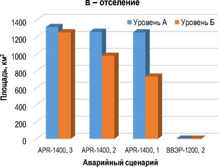 На рис. 2 отражены площади (S), на которых необходимо выполнять защитные мероприятия согласно дозовым критериям [7] в рамках «условной» и «безусловной» стратегий (уровни А, Б). Для ВВЭР-1200 показатель S, рассчитанный в рамках сценария 2 по критерию уровня Б, имеет ненулевое значение (0,38 км2) только для защитной меры «укрытие». Площади с превышением критериев уровня А для мероприятий «укрытие», «эвакуация» и «отселение» составили 11,8; 0,38 и 2,6 км2 соответственно.