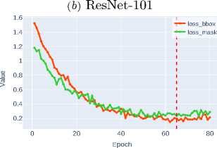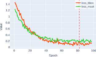 The loss functions for bounding box regression ( loss_bbox ) and mask detection ( loss_mask ) are critically important components of the composite optimization function in instance segmentation tasks. Loss_bbox ensures precise object positioning by minimizing the discrepancy between predicted and ground truth bounding box coordinates. In turn, loss_mask is responsible for the accuracy of pixel-wise classification within each ROI, guaranteeing that the predicted mask matches the object’s contour.