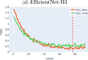 ( mAP ∼0.3121 ) through efficient feature reuse via dense connections. Increasing network depth, as implemented in ResNet-101, provides only a slight improvement in segmentation quality ( mAP ∼0.3561 ), indicating the limitations of this approach. The application of compound scaling in EfficientNet-B3 stabilizes the metrics at the level of mAP ∼0.3795 , but a true qualitative leap is observed when transitioning to modern architectural solutions.
