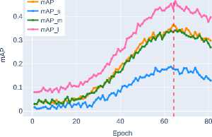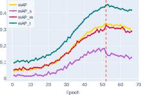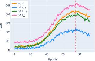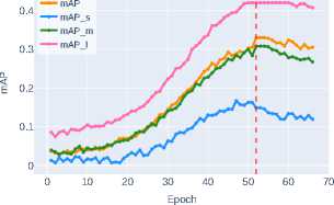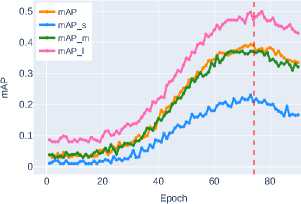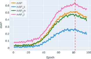 Below, in Figure 4 and Figure 5, the graphs of bounding box detection accuracy metrics bbox_mAP obtained from experimental studies for ob jects of different sizes – mAP_s , mAP_m , and mAP_l (see Section 2) are presented.