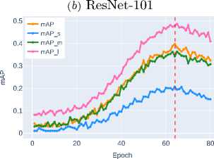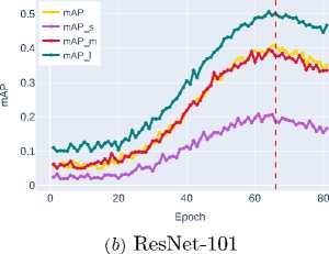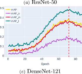 ResNet-50 demonstrates the baseline accuracy level ( mAP ∼0.3236 ), while DenseNet-121, thanks to its dense connection mechanism, shows a noticeable improvement ( mAP ∼0.3800 ). ResNet-101, despite its increased depth, shows only moderate improvement ( mAP ∼0.4080 ) compared to DenseNet-121, highlighting the limitations of simply increasing network depth.