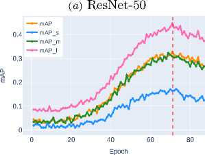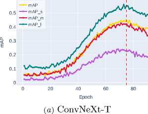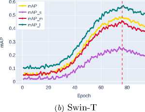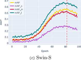 Further improvement is shown by Swin-T ( mAP ∼0.4702 ), which uses a window attention mechanism to efficiently model global contextual interactions while maintaining linear computational complexity. The best result is demonstrated by Swin-S ( mAP ∼0.5606 ), clearly illustrating the advantages of transformer architectures and their exceptional effectiveness in accurately localizing objects of all size categories, especially small ob jects, where the most significant performance gain is observed.