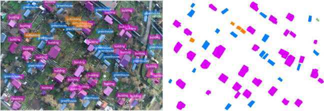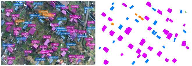 The dataset compiled for model training and validation consisted of 435 aerial images obtained by quadcopter. The dataset includes an equal number of JSON files in LabelMe format, containing arrays of polygon contour point coordinates and ob ject names (labels) of 5 types: summer house (label ’building’, 12.470 instances), greenhouse (label ’greenhouse’, 6.450 instances), outbuilding (label ’outbuilding’, 2.150 instances), vehicle (label ’vehicle’, 1.516 instances), and swimming pool (label ’swimming’, 490 instances) [12]. The dataset was partitioned into training and validation subsets with a 75% and 25% split, respectively. The training procedure was carried out on a single NVIDIA A100 80GB GPU.