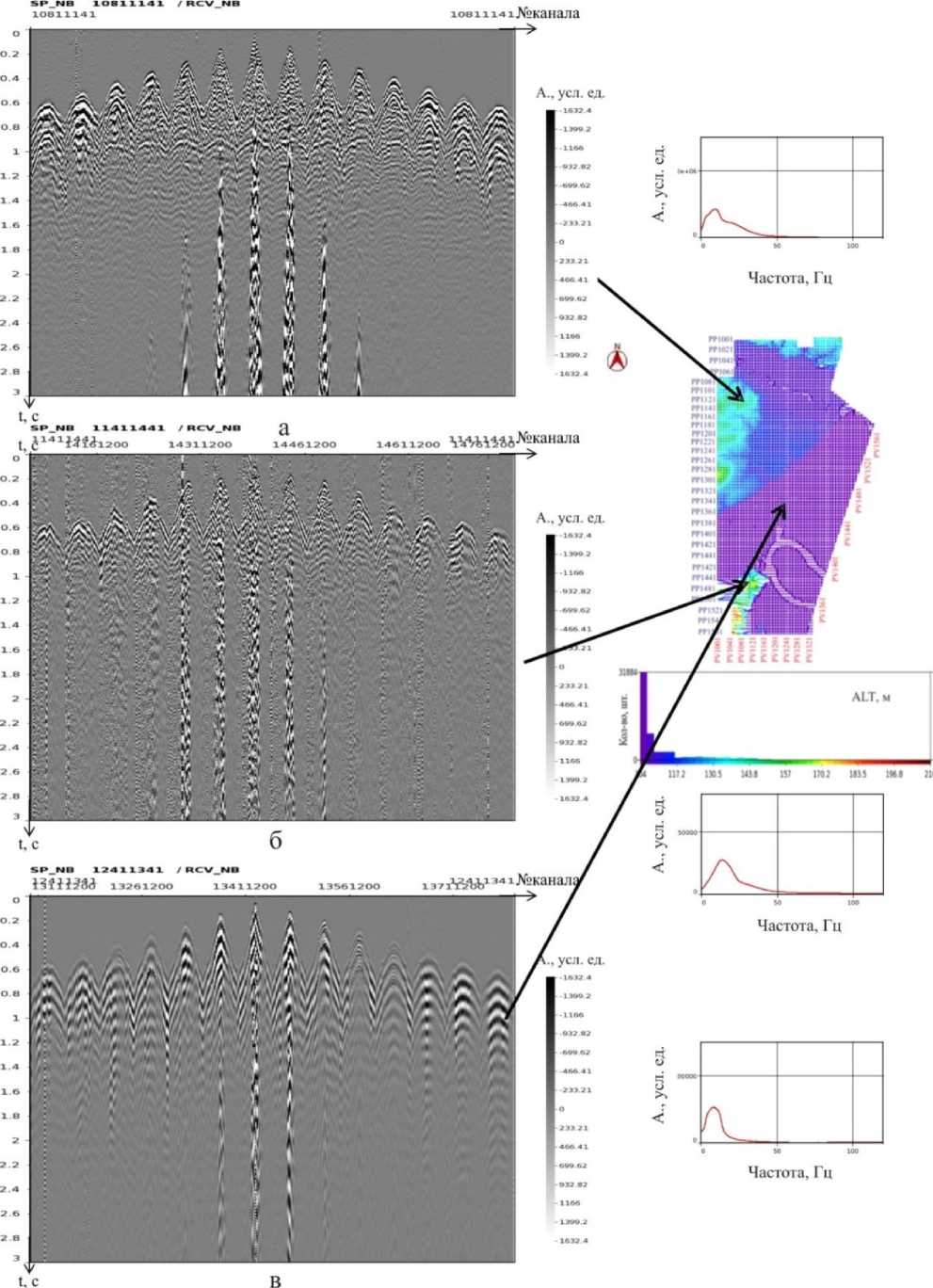 Большинство сейсмограмм имеют удовлетворительное качество. В зонах акватории наблюдаются участки с полным отсутствием материала, сейсмограммы забиты реверби-рациями. В сухопутной части площади на большинстве сейсмограмм можно проследить устойчивое поведение целевых гори- зонтов. Однако следует выделить сейсмограмму «в» (рис. 2), расположенную на акватории. Материал на данной сейсмограмме перекрывается реверберацией. Практически весь материал в акватории характеризуется преобладанием интенсивных реверберационных помех, что приводит к значительному ухудшению качества данных. Сплошной маскирующий фон, создаваемый этими помехами, практически полностью подавляет полезный сигнал, делая корректный кинематический и динамический анализ невозможным на значительной части акватории.