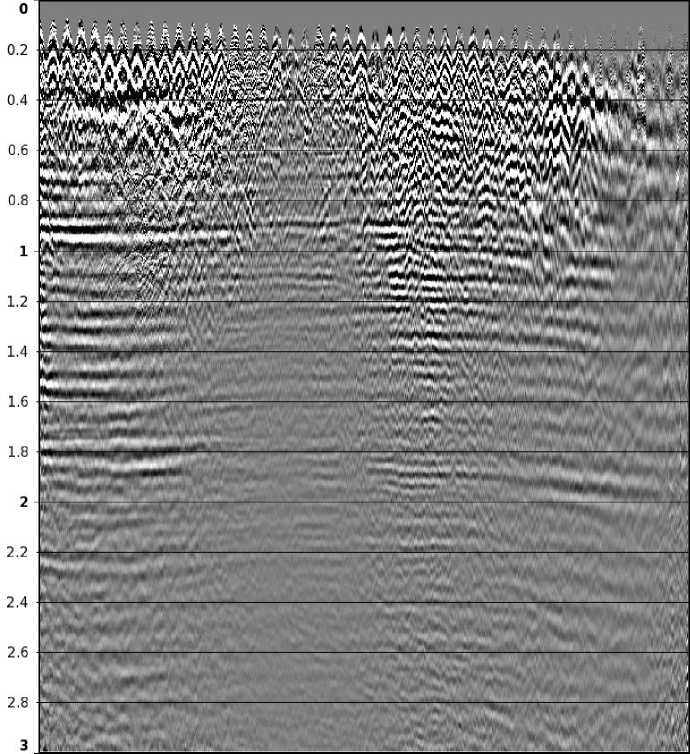 Рис. 9. Временной разрез в результате применения двух итераций высокоразрешающего подавления волн-помех в области Радона