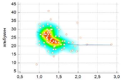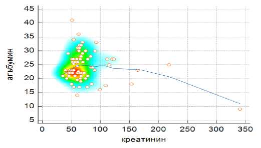 Влияние уровня альбумина на показатель креатинина (рис. 1). Чем ниже уровень альбумина, тем выше уровень креатинина. Статистическую значимость подтверждает то, что чем ниже белково-синтетическая функция печени, тем ниже почечная функция. Также мы выявили отсутствие влияния уровня альбумина и этиологии цирроза печени.