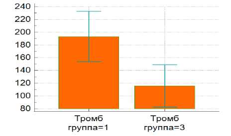 Сравнение показателя тромбоцитов между токсическими и вирусными (рис. 10). При сравнении токсических и вирусных циррозов печени достоверно значимо выраженное снижение показателя тромбоцитов при вирусной этиологии ЦП, что значимо подтверждает повышение геморрагических осложнений при вирусных циррозах печени, чем при токсических.