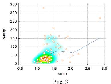 Влияние уровня билирубина на показатель МНО (рис. 3). Чем выше уровень билирубина, тем выше уровень МНО. Статистическую значимость подтверждает то, что чем выше цитолитический синдром, тем выше риск гипокоагуляции (кровотечения).