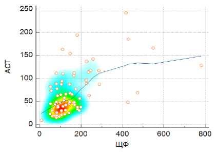 Влияние уровня АСТ на показатель ЩФ (рис. 4). Чем выше уровень АСТ, тем выше показатель холестаза. Статистическую значимость подтверждает то, что чем выше цитолитический синдром, тем выше риск холестаза.