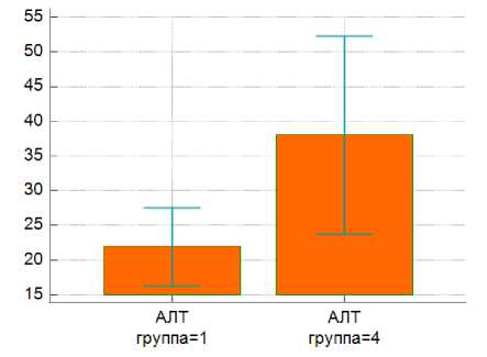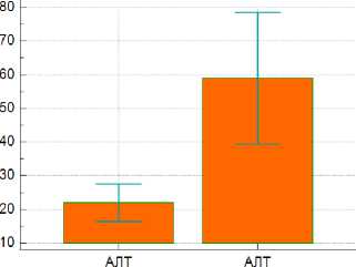 Сравнение показателя АСТ между токсическими и вирусными ЦП (рис. 6). Статистическая обработка проводилась с использованием Т-критерия для независимых выборок. При сравнении токсических и вирусных циррозов печени достоверно значимо выраженное повышение показателя разрушения гепатоцитов (АЛТ) при вирусной этиологии ЦП, чем при токсической.